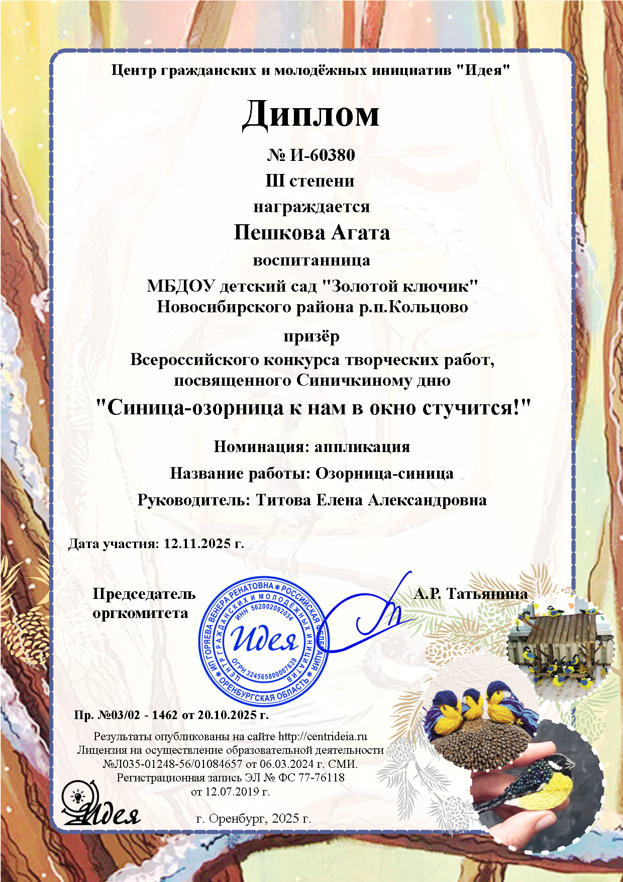 благодарность центр "Идея" за подготовку участника
